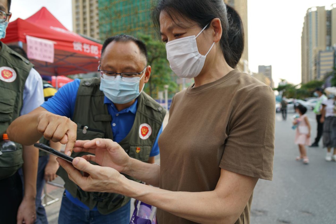 退役軍人志愿者協(xié)助前來(lái)進(jìn)行核酸檢測(cè)的市民登記信息。(攝影:李盛歡) 退役軍人志愿者們按照分工安排,提供維持秩序、檢查粵康碼、測(cè)量體溫、協(xié)助前來(lái)檢測(cè)的市民登記信息等服務(wù)。在志愿者們的引導(dǎo)下,現(xiàn)場(chǎng)秩序井然,檢測(cè)工作快速高效。
