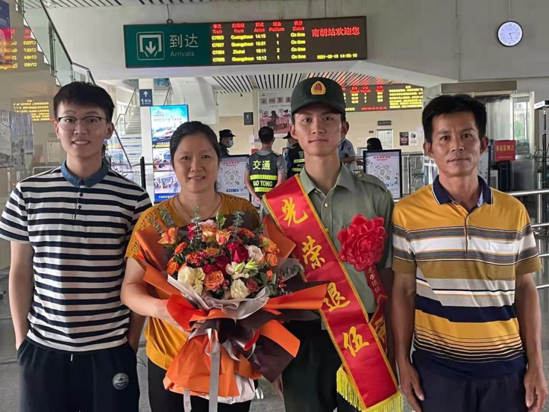 “去時鑼鼓喧天,歸來夾道歡迎。” 九月,正是退役軍人 從祖國各座軍營 返回家鄉(xiāng)的退役季 為營造“一次參軍、一生光榮”的濃厚氛圍 讓退役軍人感受到家鄉(xiāng)人民的熱情和關(guān)懷 激發(fā)老兵退伍不褪色 返鄉(xiāng)建新功的壯志熱情 9月13日下午,五桂山街道2021年首位退役軍人曾世紀光榮退役返鄉(xiāng)。街道退役軍人服務(wù)中心負責人、社區(qū)“兩委”干部、工作人員以及曾世紀的父母早早手持鮮花,在城軌南朗站等候迎接世紀回家。 回想2019入伍歡送大會時曾世紀代表五桂山即將入伍的新兵作表態(tài)發(fā)言,那年,他主動請纓,到艱苦邊遠地區(qū)服役?!皡④姴粌H是個人的榮耀,也是家人的榮耀,更是鄉(xiāng)親們的榮耀。到了部隊后我會堅決服從命令,聽從指揮,刻苦訓練,勤學本領(lǐng),絕不辜負家鄉(xiāng)人民的期望!”
