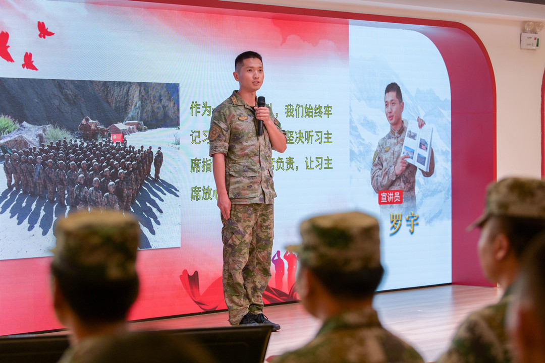 現場,新疆高原69316部隊邊防一營副政治教導員、優(yōu)秀共產黨員羅宇,中國人民解放軍91878部隊上尉干事郭開強,69316部隊邊防三營五連一班班長張長城3位部隊宣講員激情開講,分享感人的軍旅故事。  羅宇分享軍旅故事。記者 易承樂 攝