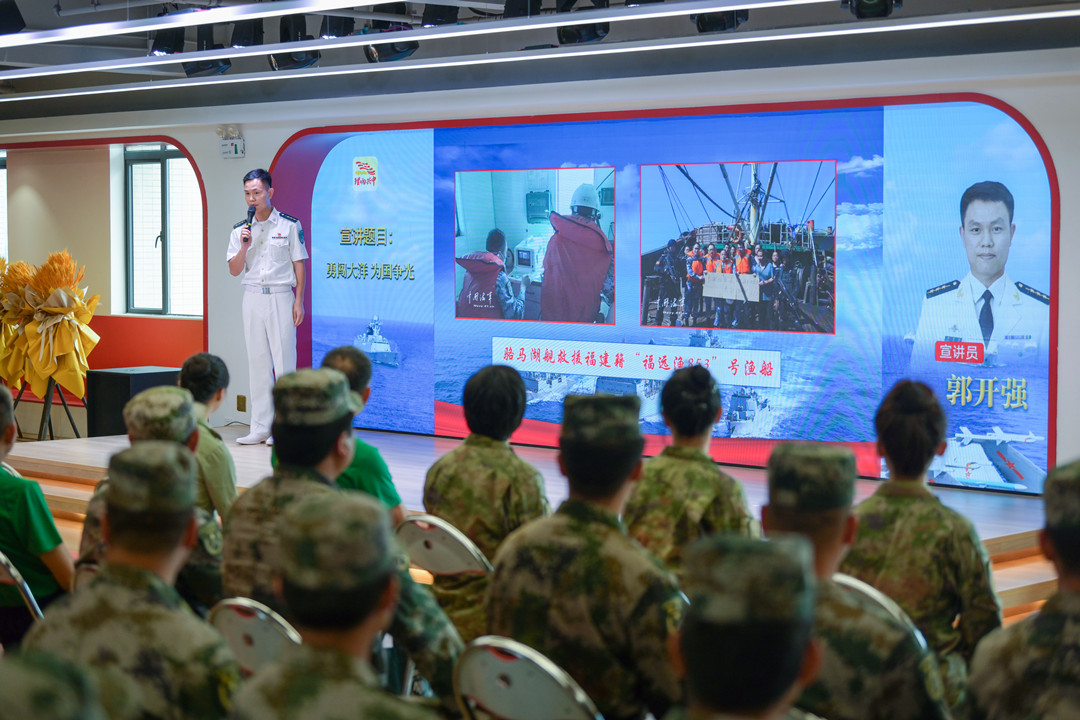 郭開強:勇闖大洋 為國爭光 2008年12月,應聯(lián)合國授權請求,奉中央軍委命令,南海艦隊武漢艦、海口艦、微山湖艦組成第1批護航編隊,拉開了人民海軍舉世矚目的亞丁灣、索馬里護航序幕,這是自600多年前鄭和下西洋以來,中國真正意義上的遠海非戰(zhàn)爭軍事行動,開啟了人民海軍從“黃水”駛向“藍水”的壯麗航程。 91878部隊郭開強干事為大家?guī)碇黝}宣講《勇闖大洋 為國爭光》。 郭開強介紹—— 迄今為止,人民海軍已累計派出44批100余艘次艦艇參加亞丁灣、索馬里海域護航,完成1500多批7000余艘中外船舶護航任務,解救、接護各類船舶近百艘,其中外國船舶超過50%。 護航官兵一次次直面生死、一次次化解危機、一次次挑戰(zhàn)極限,用忠誠與奉獻、責任與擔當,彰顯大國海軍形象,譜寫了人民海軍邁向世界一流海軍的新時代壯歌。 張長城分享軍旅故事。記者 易承樂 攝