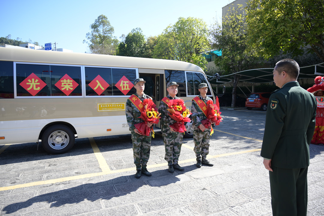 葉陽(yáng)浩、胡家威兩名準(zhǔn)新兵身披“光榮入伍”的紅色綬帶和大紅花昂首挺胸站在太陽(yáng)下,新兵家屬前來(lái)歡送。“陽(yáng)浩的堂叔叔、外公和叔公都曾應(yīng)征入伍,他能進(jìn)部隊(duì)得到鍛煉,我們作為他的父母感到很光榮、很幸福?!比~陽(yáng)浩的父母胸戴“光榮家屬”的大紅花,露出激動(dòng)的笑容。