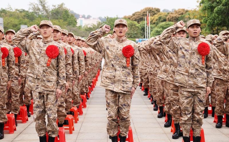 3月15日,中山市2023年新兵入伍歡送大會(huì)在中山市文化藝術(shù)中心廣場(chǎng)舉行。300多名新兵身穿迷彩服,胸戴大紅花,即將奔赴軍營(yíng)。中山軍分區(qū)大校司令員、市征兵工作領(lǐng)導(dǎo)小組副組長(zhǎng)李云濤,市委常委、中山軍分區(qū)大校政治委員、市征兵工作領(lǐng)導(dǎo)小組副組長(zhǎng)劉燦瑩,市征兵工作領(lǐng)導(dǎo)小組副組長(zhǎng)、副市長(zhǎng)、市公安局局長(zhǎng)魯罡,市征兵工作領(lǐng)導(dǎo)小組副組長(zhǎng)、市征兵辦主任、軍分區(qū)大校副司令員李健出席送兵儀式。 300多名新兵身穿迷彩服,胸佩大紅花,即將奔赴軍營(yíng)。記者 文波 攝