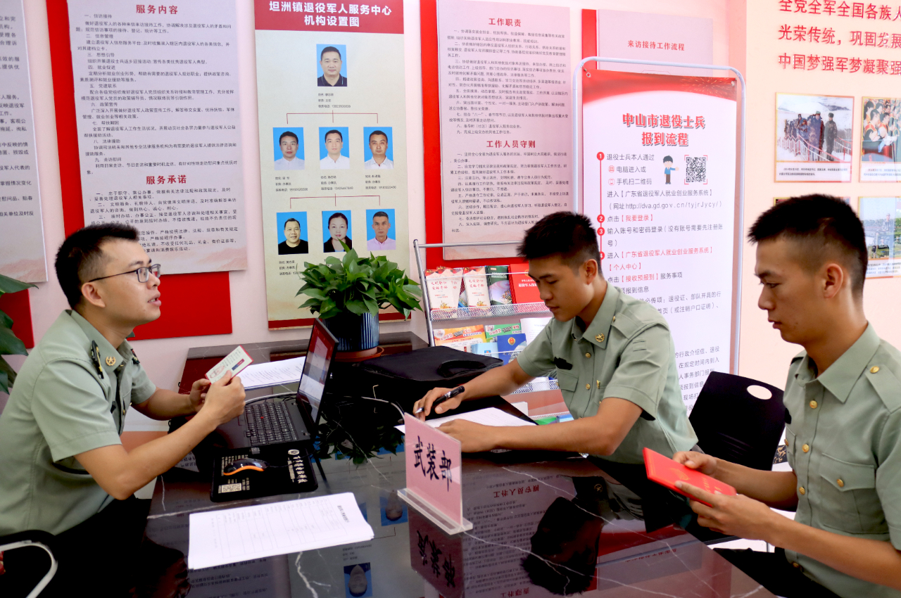 退役士兵返鄉(xiāng)前夕,坦洲鎮(zhèn)退役軍人服務(wù)中心就提前建立坦洲鎮(zhèn)2021年秋季退役士兵報到微信群,退役士兵加群后可查閱相關(guān)政策及業(yè)務(wù)事項、通知及信息,有疑問提出的話工作人員在群內(nèi)第一時間回復(fù)和解答問題。為簡化報到流程、提高效率,讓退役士兵少跑路,坦洲鎮(zhèn)公共服務(wù)辦公室積極謀劃,與人民武裝部聯(lián)合辦公,派出工作人員進(jìn)駐鎮(zhèn)退役軍人服務(wù)中心辦理預(yù)備役登記手續(xù)并做好相關(guān)政策宣傳及解釋工作。預(yù)備役登記手續(xù)辦結(jié)后,由退役軍人服務(wù)中心依次辦理報到登記、信息采集、組織關(guān)系轉(zhuǎn)接,并在政務(wù)服務(wù)大廳設(shè)立專窗辦理醫(yī)、社保接續(xù),在公安分局設(shè)立專窗辦理戶口落戶、換領(lǐng)身份證等服務(wù)保障項目。讓退役士兵享受方便快捷的報到服務(wù),體會“家”的溫馨。