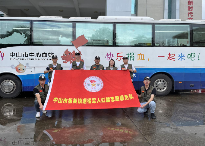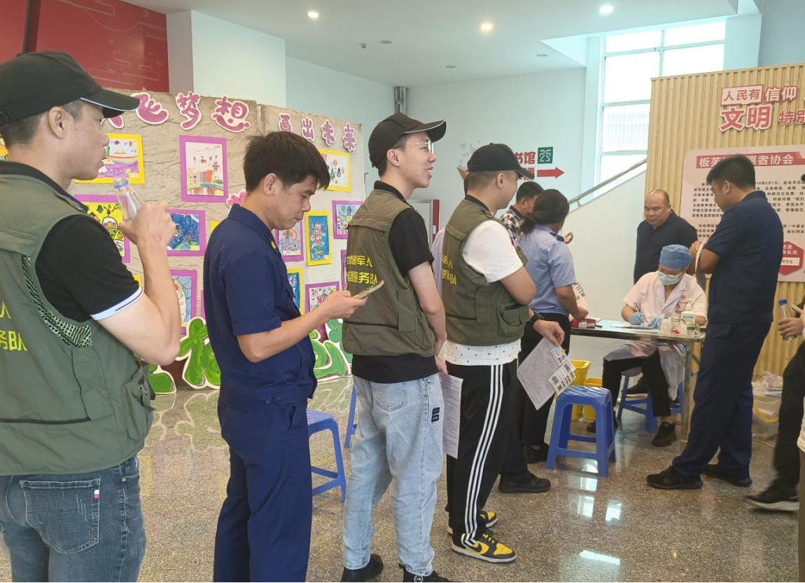 板芙鎮(zhèn)退役軍人紅旗志愿服務隊隊員排隊等候無償獻血。