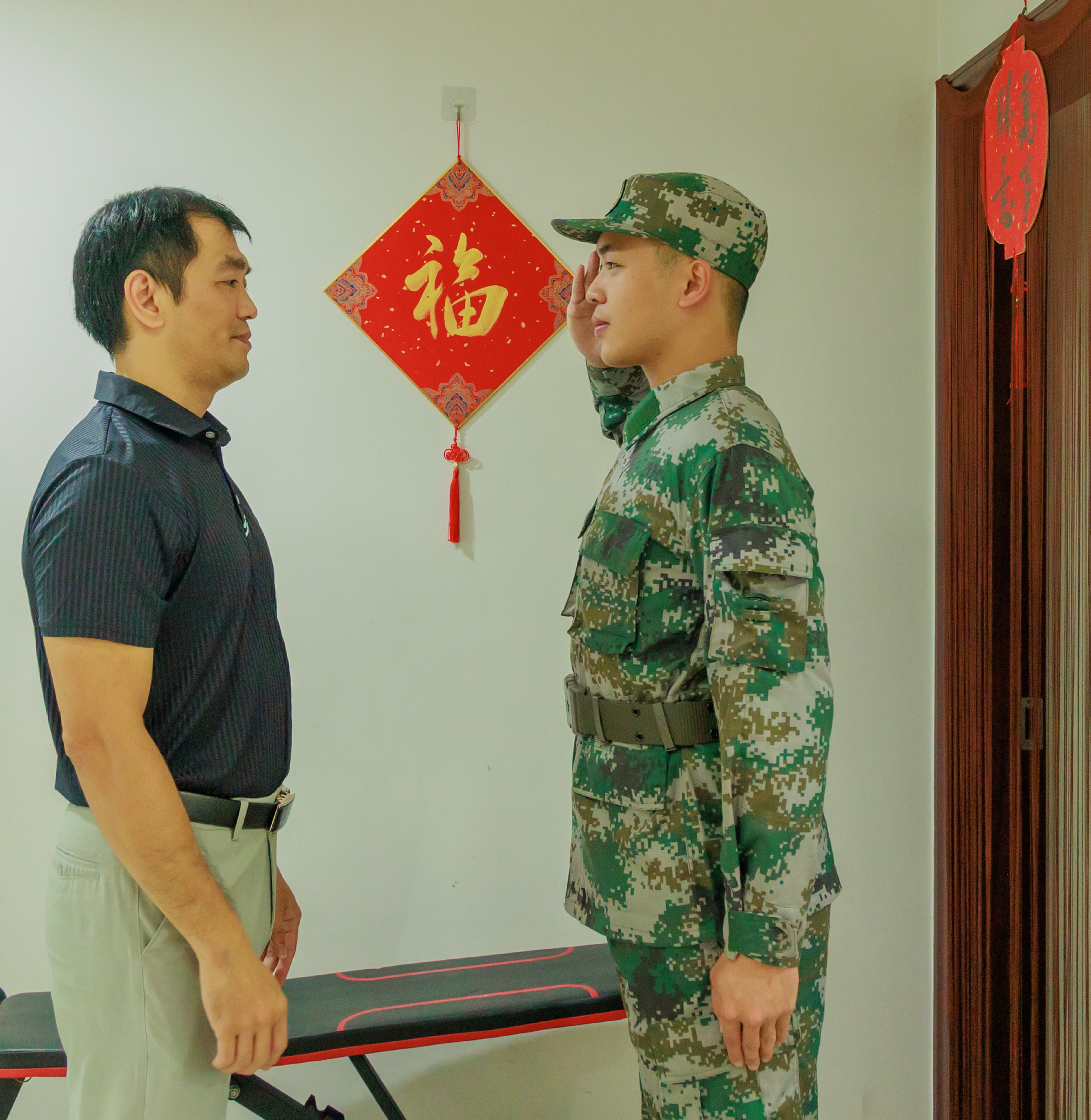 “我將把五彩的夢(mèng)想交給迷彩去儲(chǔ)藏……”9月8日,中山市東區(qū)街道舉行2023年下半年入伍青年歡送座談會(huì),新兵代表?xiàng)钌辛丶?dòng)地說。楊尚霖現(xiàn)已領(lǐng)取入伍通知書,并前往中山市國防教育基地開展役前訓(xùn)練,幾天后將啟程前往部隊(duì)服役。 楊尚霖給父親敬禮。馬衛(wèi)星 攝