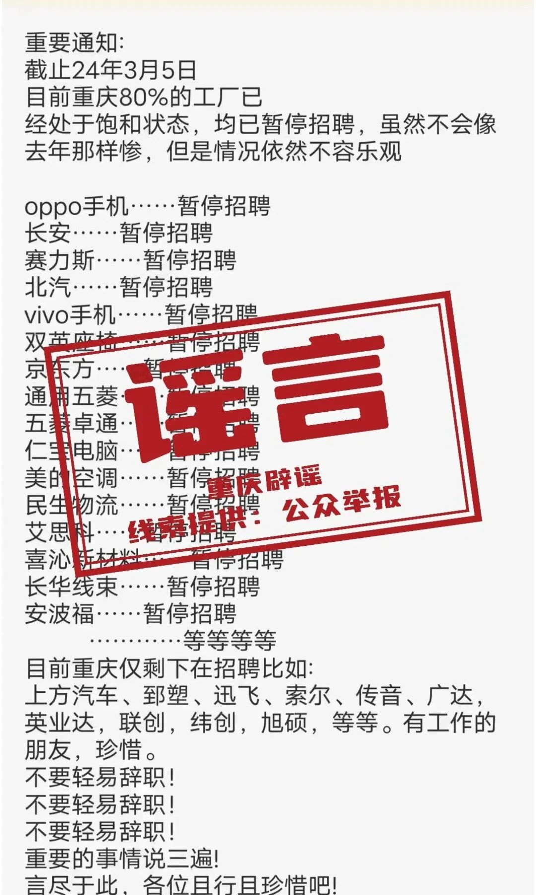 近日,有網(wǎng)民在某網(wǎng)絡(luò)平臺上發(fā)布信息:“目前重慶市80%的廠已處于飽和狀態(tài),均已暫停招聘”,引發(fā)社會關(guān)注。經(jīng)相關(guān)部門核實(shí),網(wǎng)傳信息為謠言。