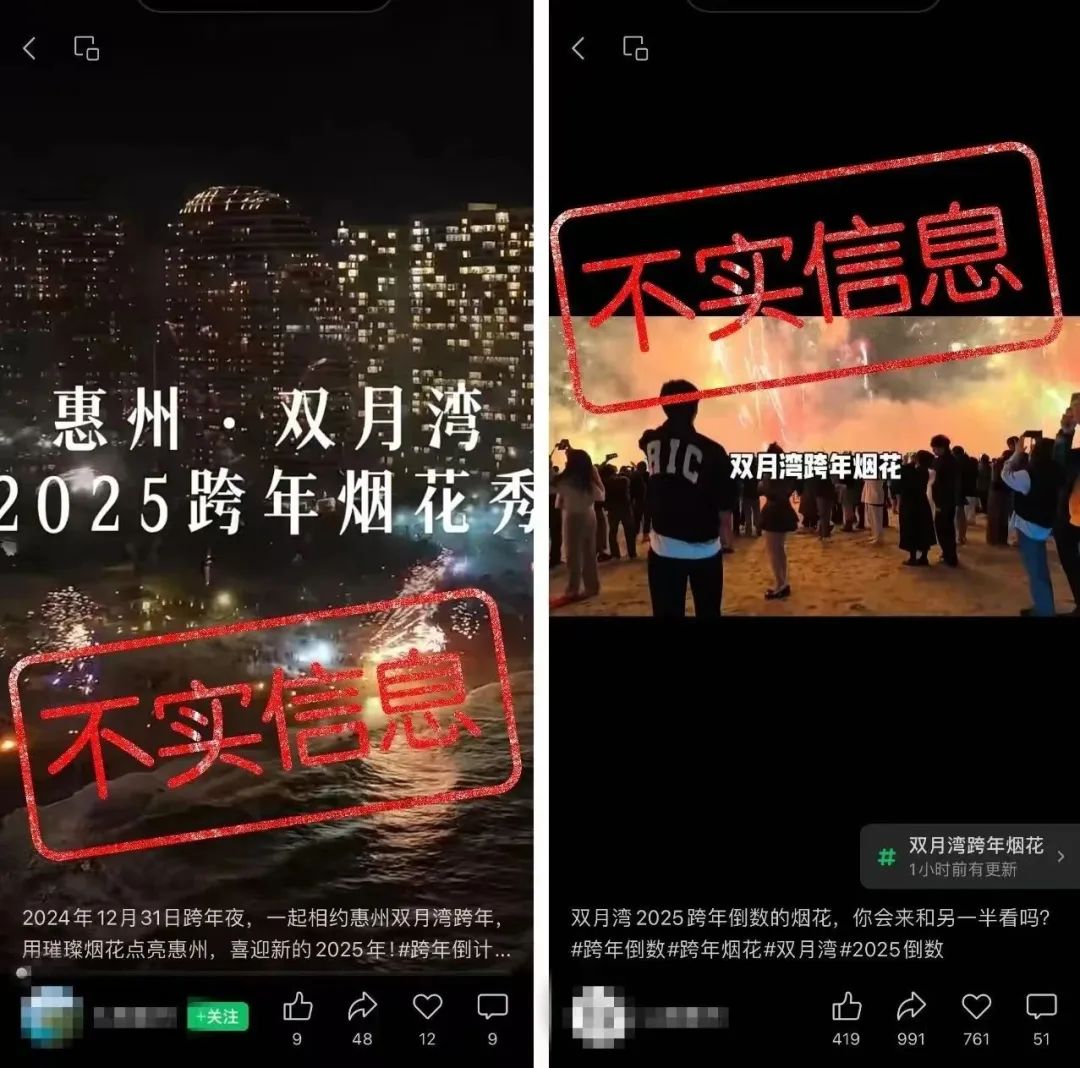 經核實,目前惠東雙月灣沒有舉辦2025年跨年煙花秀活動的安排,網傳“惠州雙月灣2025跨年煙花秀”或稱“惠州雙月灣跨年海岸線均可燃放煙花”“2025年惠州雙月灣跨年煙火(花)秀(表演)”等相關信息均系不實信息。