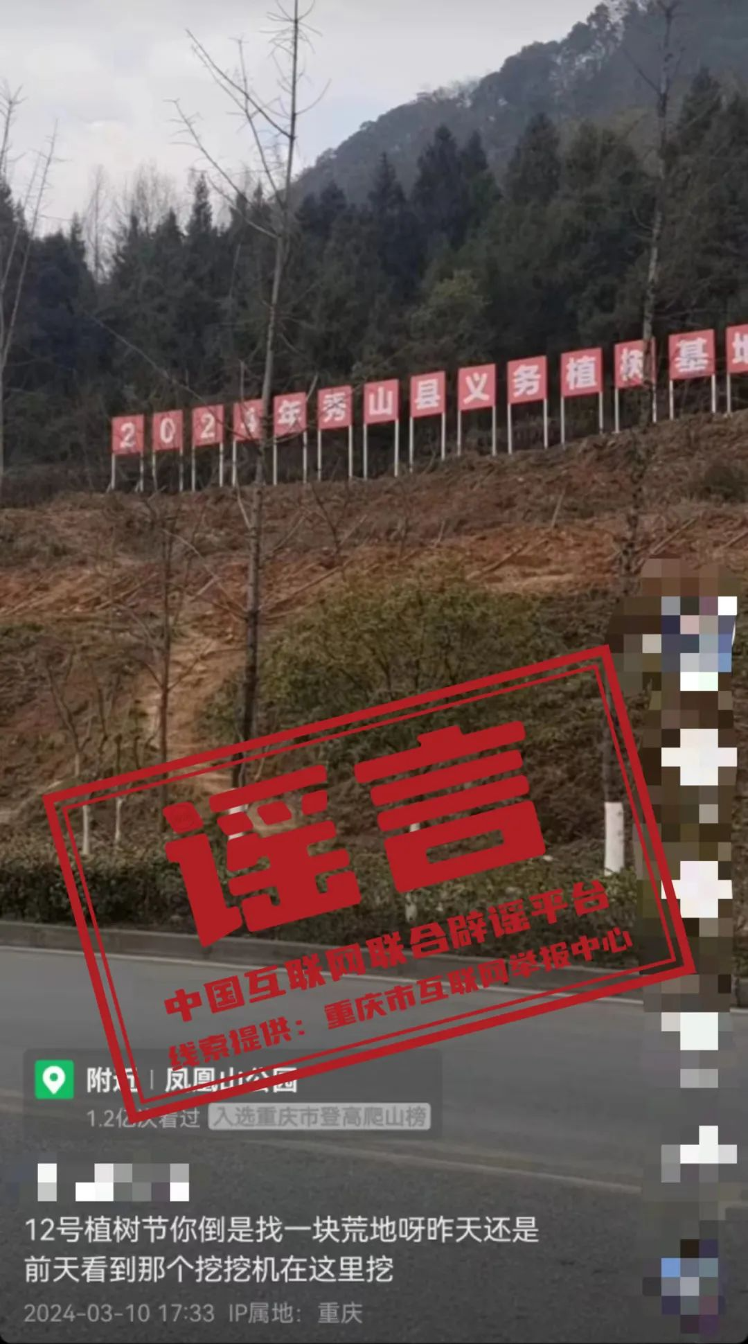 謠 言 重慶市秀山縣鳳凰山公園把原有樹木挖了來辦植樹節(jié)?