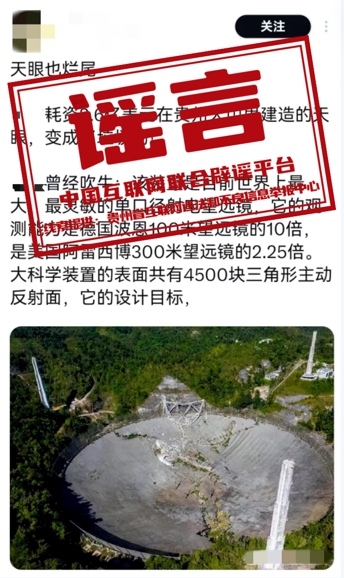 真相:近日,海外社交平臺有網(wǎng)民發(fā)布一張圖片,聲稱“耗資2.6億美元在貴州大山里建造的天眼,變成了垃圾場!”對此,“貴州辟謠”官方微信公眾號發(fā)布消息稱,網(wǎng)傳說法為謠傳,網(wǎng)傳圖片實為美國波多黎各的阿雷西博天文臺(Arecibo Observatory)于2020年12月發(fā)生徹底坍塌的畫面,該天文臺主要的觀測裝置為阿雷西博射電望遠鏡。事實上,這并非“中國天眼”第一次“被坍塌”,2020年阿雷西博望遠鏡第一次出現(xiàn)嚴重損壞之際,網(wǎng)絡中就曾出現(xiàn)過類似謠言。