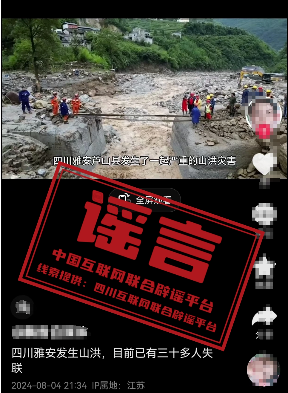 謠 言 四川雅安蘆山縣發(fā)生山洪災(zāi)害致三十多人失聯(lián)?