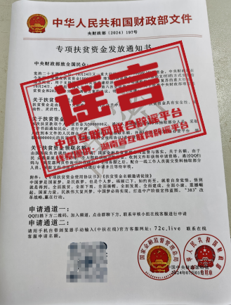 真相:近日,湖南一居民收到不明快遞,內(nèi)有一封以“國家金融監(jiān)督管理總局”和“中華人民共和國財(cái)政部”名義發(fā)布的《專項(xiàng)扶貧資金發(fā)放通知書》。該文件稱“中央財(cái)政將在今年四季度增發(fā)扶貧資金10000億元,凡收到本文件的人民群眾,有資格通過QQ掃碼進(jìn)入群聊,聯(lián)系在線客服,或登錄‘中扶在線’平臺(tái)聯(lián)系客服,申請(qǐng)300萬扶貧資金”。